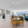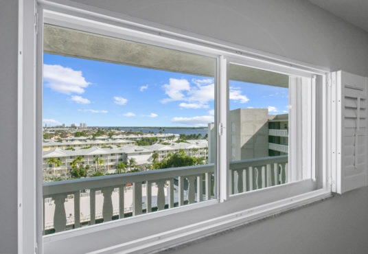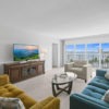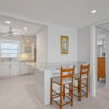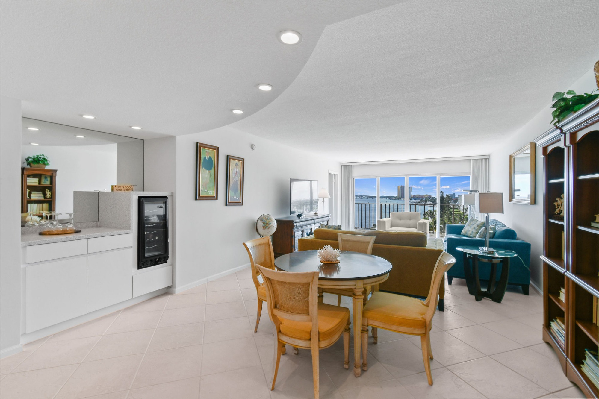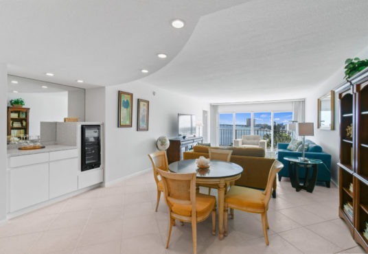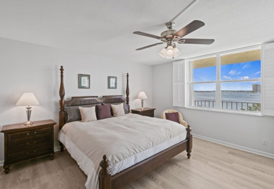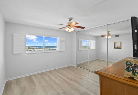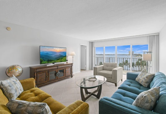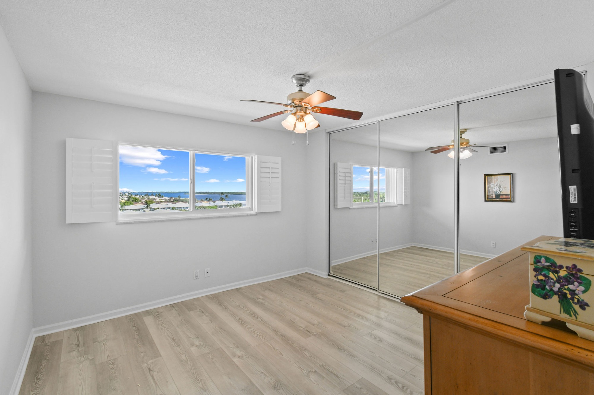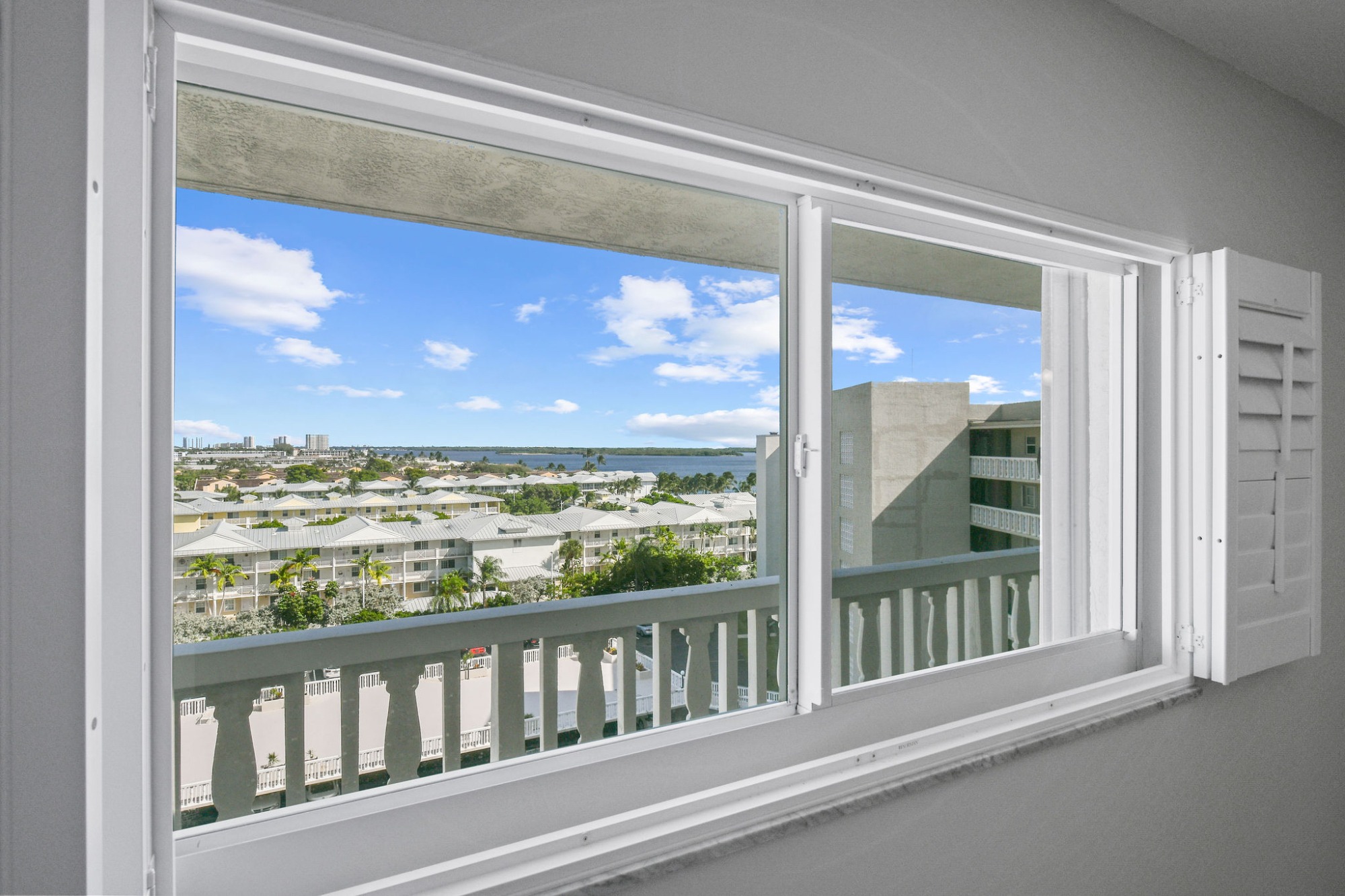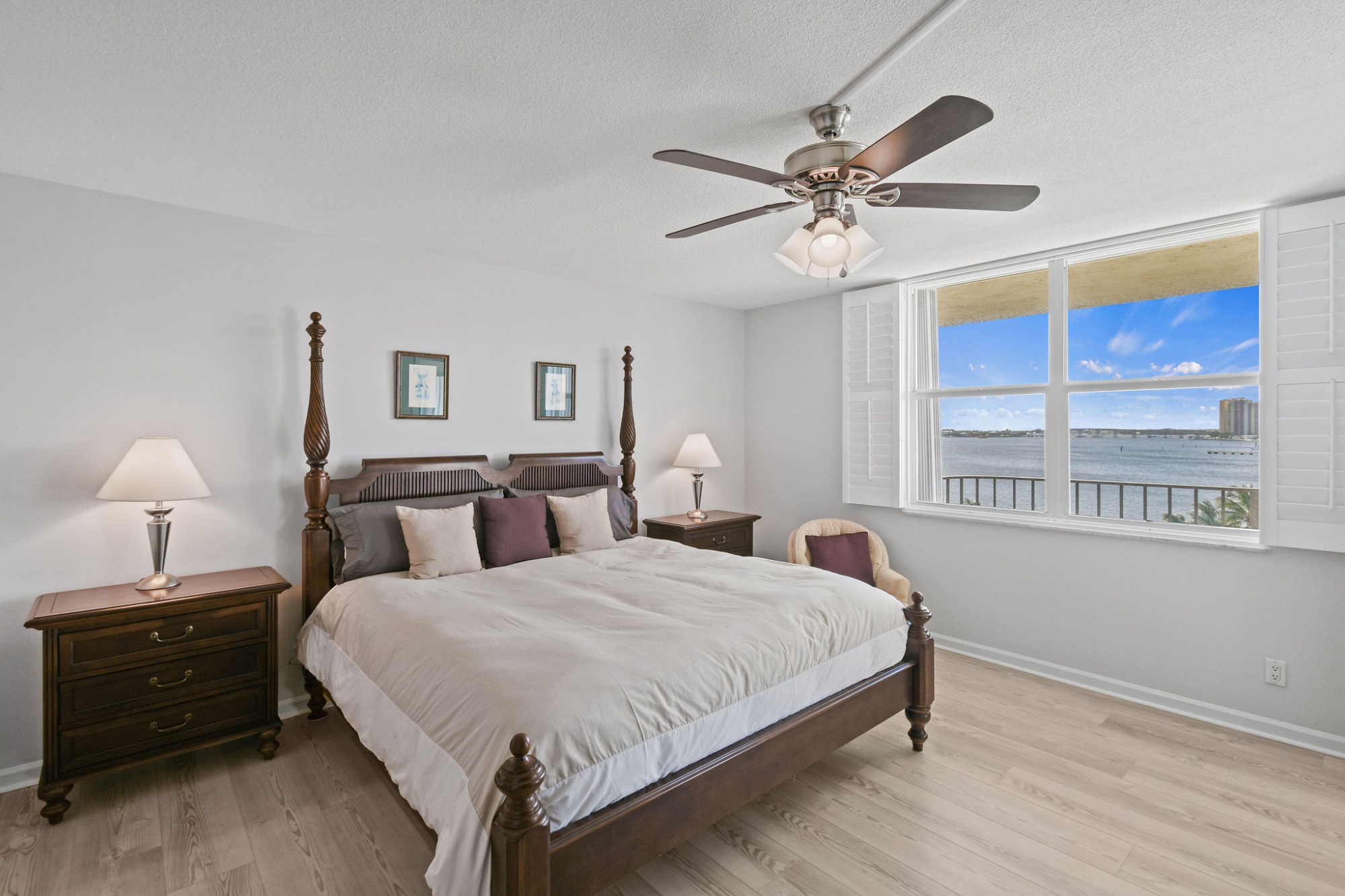 Sweeping Intracoastal views capture your attention from this top-floor condo, offering glowing sunsets and water vistas from every room. Enjoy southeast breezes from your private balcony — perfect for relaxing or entertaining. The open-concept design enhances natural light throughout. The primary suite features an expanded en-suite bath, closets, and laundry area, thoughtfully framed by double pocket doors for added privacy and quiet comfort. The guest bedroom and bath also have a dedicated pocket door for separation. Other features include tile flooring in the main living areas and luxury vinyl plank in the bedrooms, a full-size WD, and abundant updated dimmable lighting. Plantation shutters throughout. Accordion shutters. New WH; Freshly Repainted Interior!
